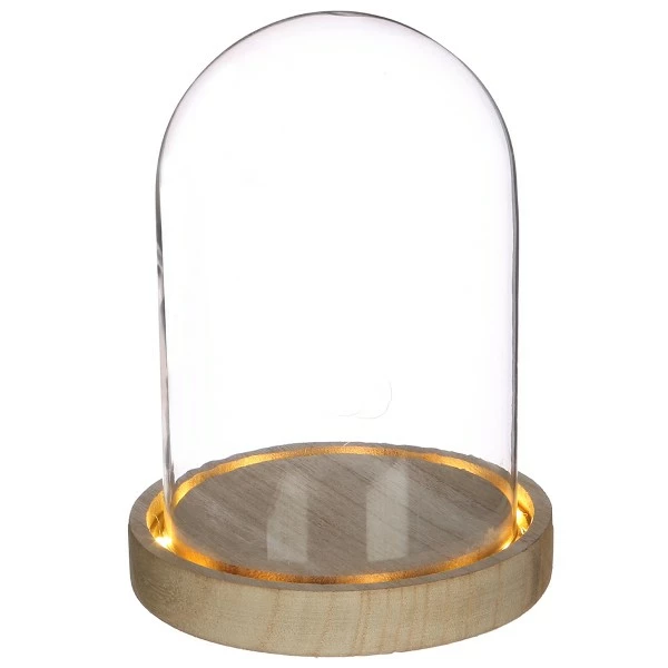 Cloche en verre lumineuse avec socle en bois pour la déco