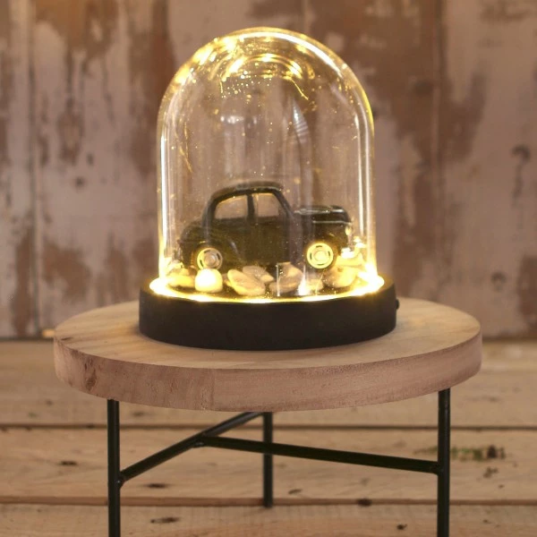 Cloche en verre lumineuse avec socle en bois pour la déco