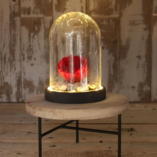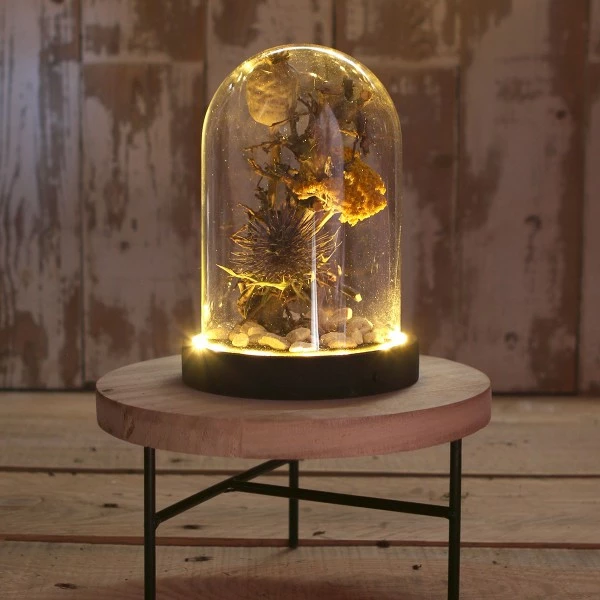 Cloche en verre lumineuse avec socle en bois pour la déco