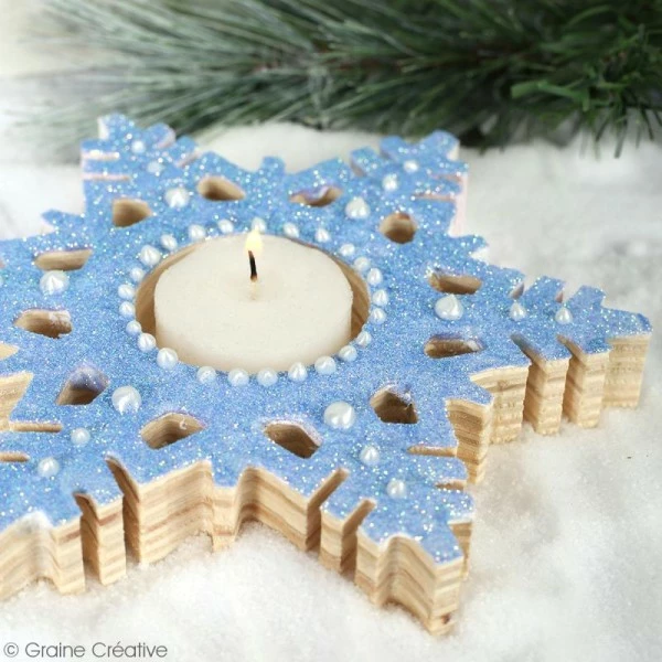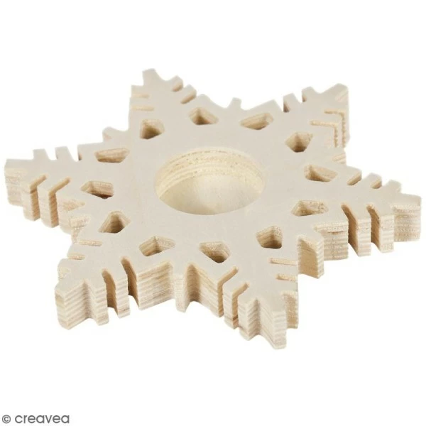 Porte bougie Flocon en bois de 15 x 15 cm à décorer selon vos envies pour agrémenter votre intérieur et créer des ambiances chaleureuses en toute simplicité.Vous pourrez y mettre une bougie chauffe-plat ou tout autre bougie de 4,5 cm de diamètre.