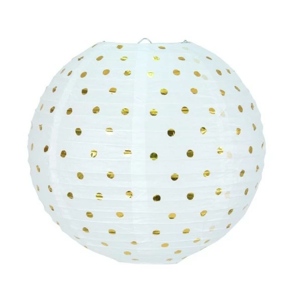 Description de Lanterne Japonaise blanche à pois or, diam. 35 cm, Lampion boule Papier, à suspendre